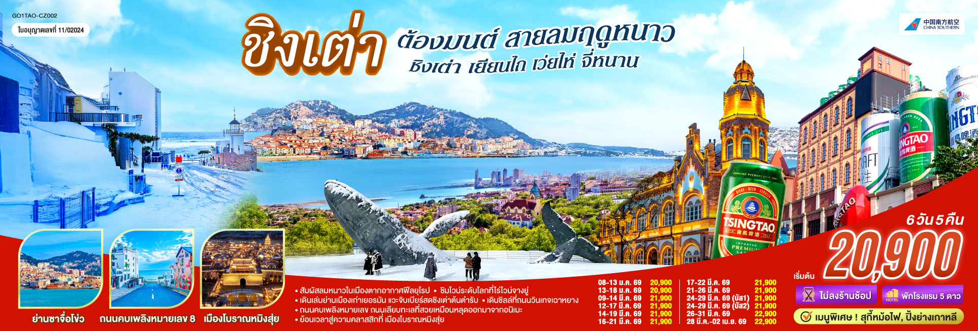 บินตรงชิงเต่า สี่เมืองสุดชิค จิบไวน์หรู ดูโรงเบียร์ ชิงเต่า เยียนไถ เผิงไหล เว่ยไห่ 6 วัน 4 คืน โดยสายการบิน ซานตง แอร์ไลน์ (SC)