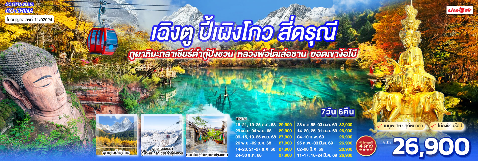 เฉิงตู อุทยานปี้เผิงโกว อุทยานสวรรค์ภูผาหิมะ กลาเซียร์ต๋ากู่ปิงชวน อุทยานจิ่วจ้ายโกว อุทยานโหมวหนีโกว(นั่งรถไฟความเร็วสูง) *ไม่ลงร้านช้อป* 6วัน 5คืน โดยสายการบิน Thai Lion Air (SL)