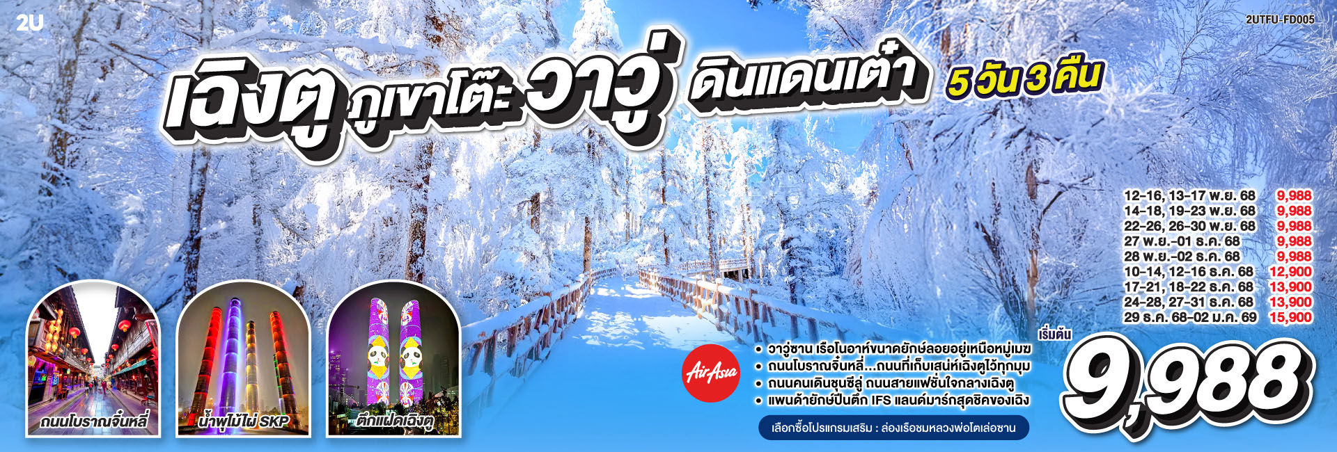 เที่ยว 3 เมือง 3 อุทยาน เฉิงตู ฉงชิ่ง อู่หลง อุทยานสี่ดรุณี อุทยานหลุมบ่อฟ้า อุทยานเขานางฟ้า 6 วัน 4 คืน **ไม่เข้าร้านช้อป** โดยสายการบิน Air Asia (FD)