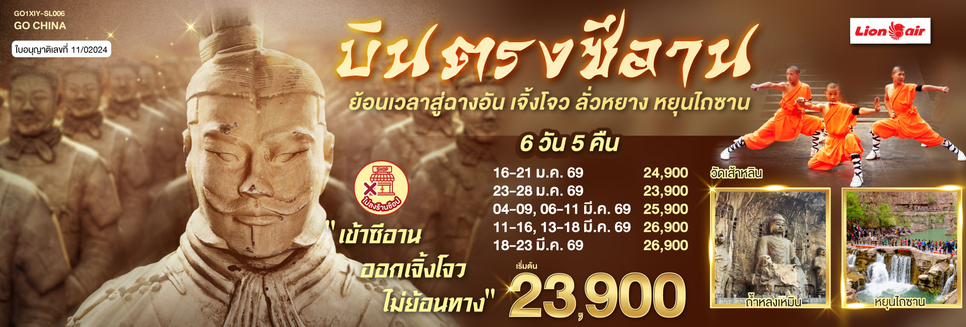 บินตรงเจิ้งโจว ซีอาน ลั่วหยาง ท่องเวลาหาจิ๋นซี เที่ยวครบสูตร 4 มรดกโลก ถ้ำหลงเหมิน วัดเส้าหลิน กั่วเลี่ยงชุน 7 วัน 5 คืน โดยสายการบิน ไทย ไลออนแอร์ (SL)