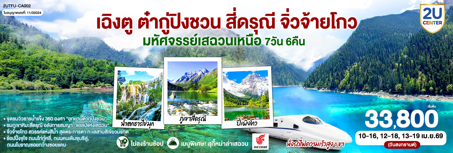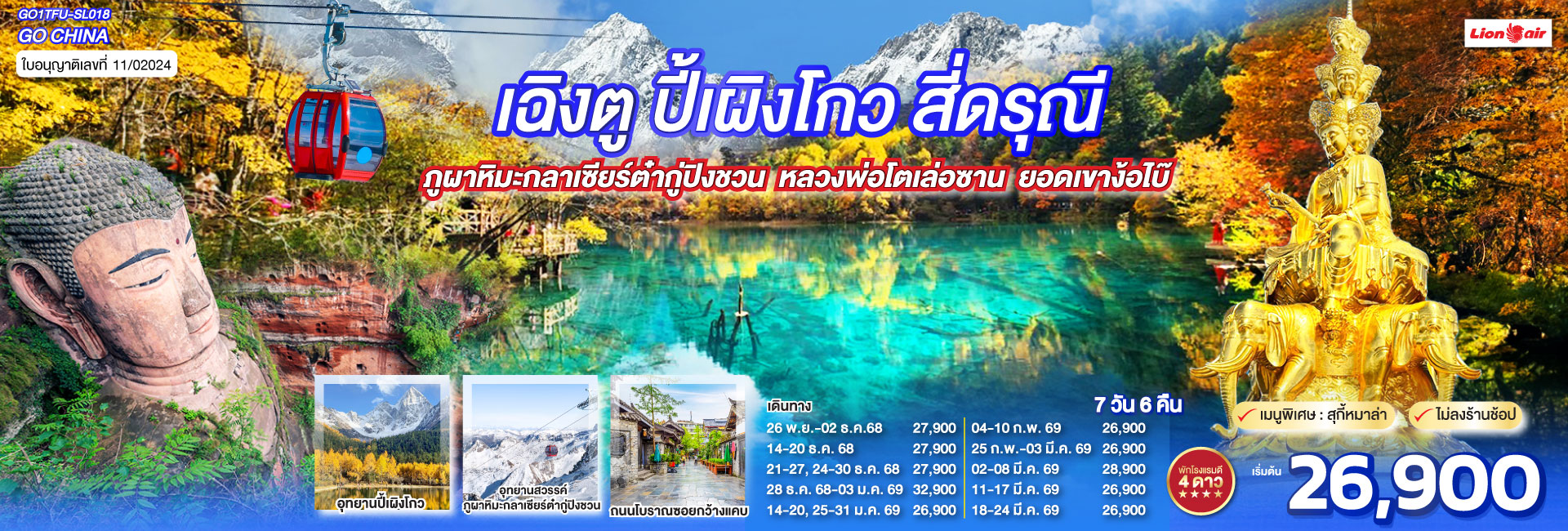 เฉิงตู อุทยานปี้เผิงโกว อุทยานสวรรค์ภูผาหิมะ กลาเซียร์ต๋ากู่ปิงชวน อุทยานจิ่วจ้ายโกว อุทยานโหมวหนีโกว(นั่งรถไฟความเร็วสูง) *ไม่ลงร้านช้อป* 6วัน 5คืน โดยสายการบิน Thai Lion Air (SL)