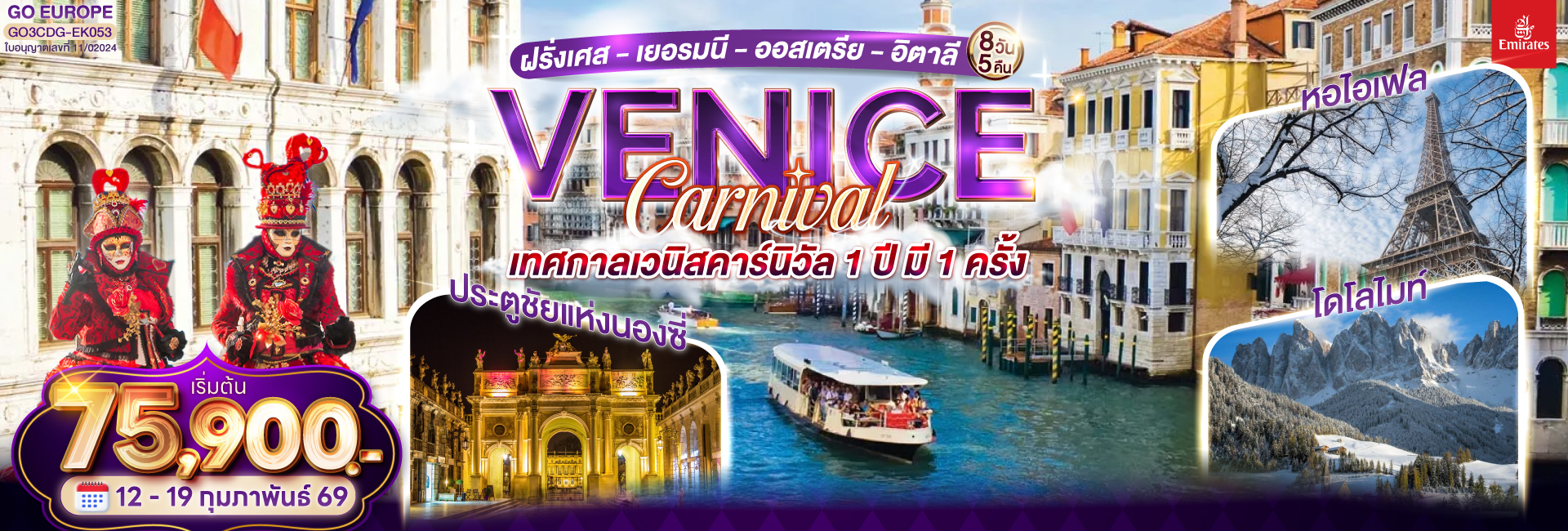 VENICE CARNIVAL เทศกาลเวนิสคาร์นิวัล 1 ปี มี 1 ครั้ง ฝรั่งเศส - เยอรมนี - ออสเตรีย - อิตาลี 8 วัน 5 คืน โดยสายการบิน Emirates (EK)