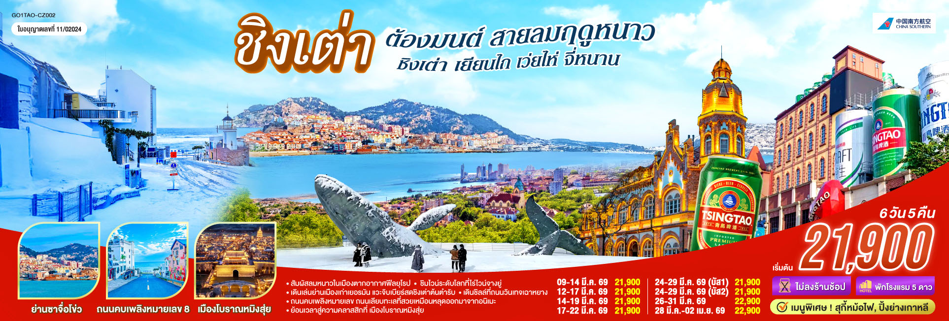 ชิงเต่า ต้องมนต์ สายลมฤดูหนาว ชิงเต่า เยียนไถ เว่ยไห่ จี่หนาน 6 วัน 5 คืน โดยสายการบิน ไชน่า เซาเทิร์น (CZ)