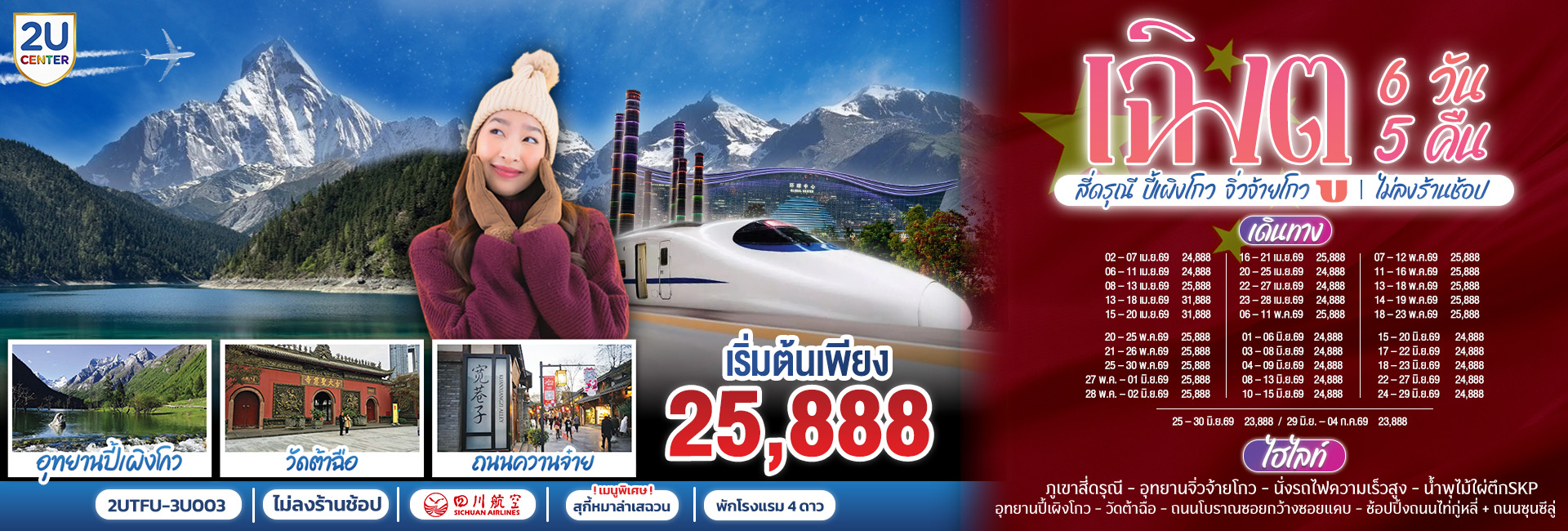 บินตรงเชียงใหม่ เฉิงตู ภูเขาสี่ดรุณี ธารน้ำแข็งต๋ากู่ จิ่วจ้ายโกว 6 วัน 5 คืน ** นั่งรถไฟความเร็วสูง 1 เที่ยว ** โดยสายการบิน Chengdu Airlines (EU) ** เที่ยวเต็มอิ่ม..ไม่ลงร้านช้อป**
