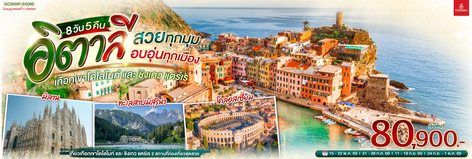 อิตาลี สวยทุกมุม อบอุ่นทุกเมือง เทือกเขาโดโลไมท์ และ ชิงเกว แตร์เร 8 วัน 5 คืน โดยสายการบิน EMIRATES (EK)