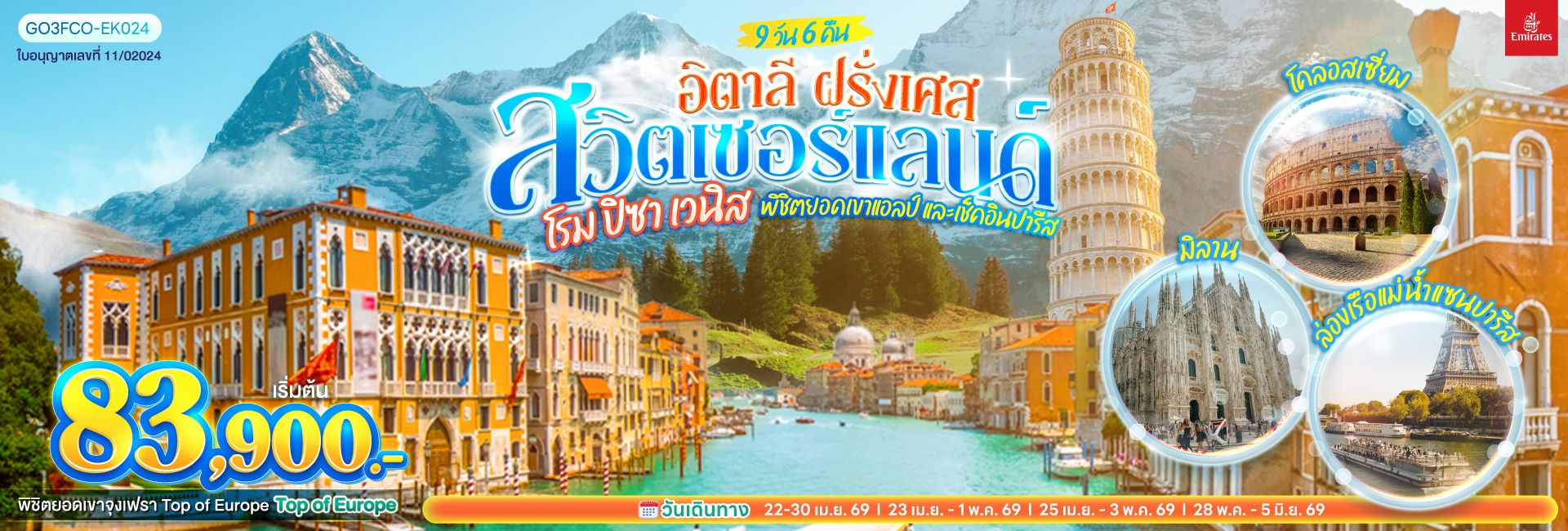 อิตาลี - สวิตเซอร์แลนด์ – ฝรั่งเศส โรม ปิซา เวนิส พิชิตยอดเขาแอลป์ และเช็คอินปารีส 9 วัน 6 คืน โดยสายการบิน EMIRATES (EK)