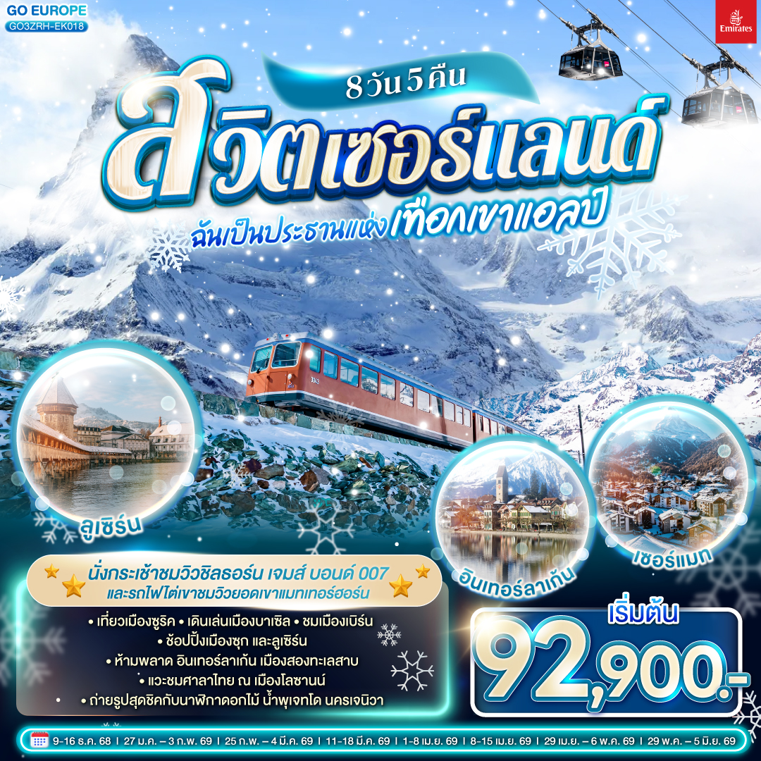 “ท้องฟ้าสีครามตัดกับภูเขาหิมะ บรรยากาศเย็น ๆ แสนสบาย ทุ่งหญ้าเขียวขจี” คำเหล่านี้คงจะอธิบายความเป็นสวิตเซอร์แลนด์ได้ดีที่สุด จนทำให้ประเทศนี้กลายเป็นสถานที่ท่องเที่ยวอันดับต้น ๆ ของผู้คนที่อยากทัวร์ยุโรป 2566-2567 เลยก็ว่าได้ เช่น เซอร์แมทดินแดนเล็ก ๆ ที่ล้อมรอบด้วยภูเขา ตั้งอยู่บนเทือกเขาแอลป์บนยอดเขาที่ใครไปทัวร์สวิตเซอร์แลนด์ ก็ต้องตกหลุมรักและยกให้เป็นสถานที่สุดโปรด