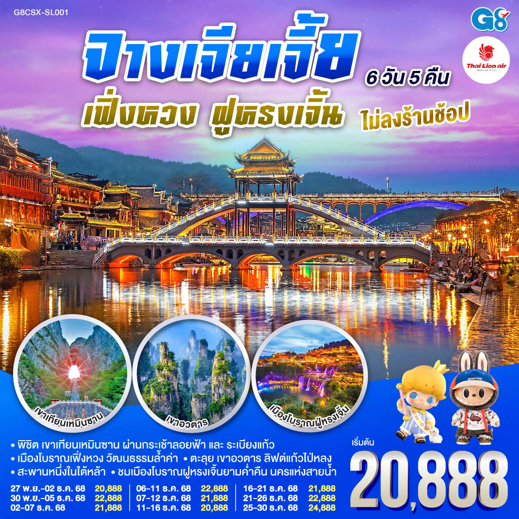 | 1 | กรุงเทพฯ (ดอนเมือง) – ฉางซา (ท่าอากาศยานนานาชาติฉางซา หวงฮัว) (SL934 : 09:35 - 13:45) – ถนนโบราณต้าเสี่ยวเหอ - จางเจียเจี้ย | ✘ | ✘ | ✔ | METROPOLO JINJIANG หรือเทียบเท่าระดับ 4 ดาว (มาตรฐานประเทศจีน) |