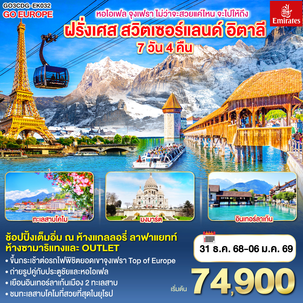 | 2 | สนามบินดูไบ – ปารีส - ถ่ายรูปประตูชัย – ถ่ายรูปหอไอเฟล – ล่องเรือแม่น้ำแซนน์ - ชอปปิงห้างแกลลอรี่ ลาฟาแยตต์ | ✘ | ✔ | ✔ | BRIT PRIVILEGE PARIS Eหรือเทียบเท่า |