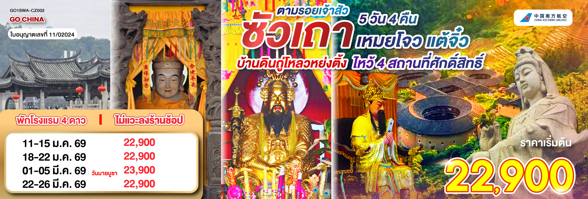 ซัวเถา แต้จิ๋ว เสริมดวงมงคล 5วัน 4คืน ชมมรดกโลกบ้านดินถู่โหลวเถียนโหลวเคิง หนานจิ้ง โดยสายการบิน CHINA SOUTHERN (CZ)