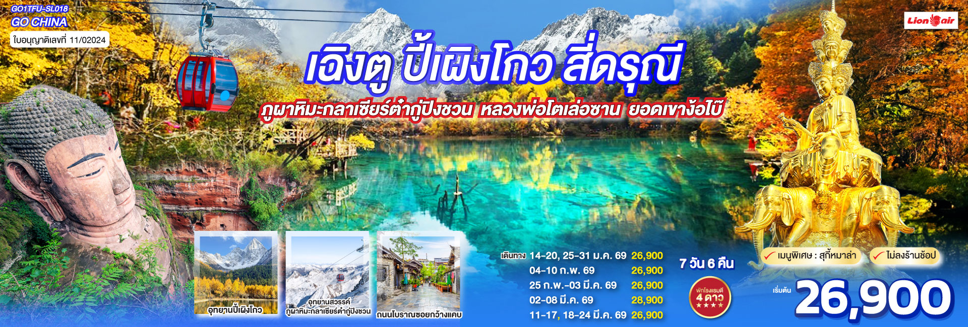เฉิงตู อุทยานปี้เผิงโกว อุทยานสวรรค์ภูผาหิมะ กลาเซียร์ต๋ากู่ปิงชวน อุทยานจิ่วจ้ายโกว อุทยานโหมวหนีโกว(นั่งรถไฟความเร็วสูง) *ไม่ลงร้านช้อป* 6วัน 5คืน โดยสายการบิน Thai Lion Air (SL)