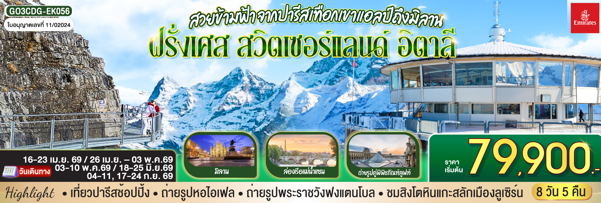 จุงเฟรา ว๊าวซ่า ฝรั่งเศส – สวิตเซอร์แลนด์ – อิตาลี 8 วัน 5 คืน โดยสายการบิน Emirates (EK)
