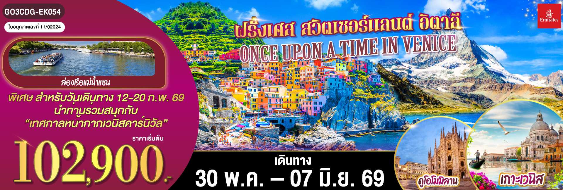 อิตาลี - สวิตเซอร์แลนด์ – ฝรั่งเศส โรม ปิซา เวนิส พิชิตยอดเขาแอลป์ และเช็คอินปารีส 9 วัน 6 คืน โดยสายการบิน EMIRATES (EK)
