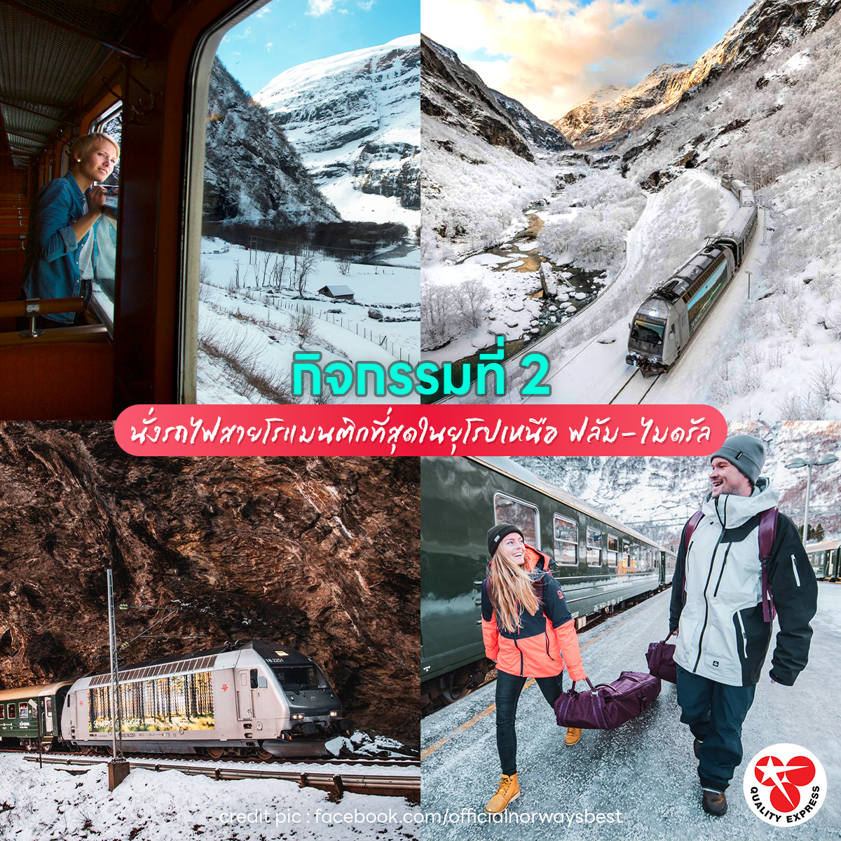 (นั่งรถไฟสายโรแมนติดที่สุดในยุโรปเหนือ ฟลัม-ไมดรัล)กิจกรรมที่ 2 นั่งรถไฟสายโรแมนติก ฟลัม-ไมดรัลรถไฟสายโรแมนติก “ฟลัมบาน่า” หนึ่งในเส้นทางรถไฟที่สูง และสวยที่สุดในโลกที่ขับเคลื่อนโดยหัวรถจักรแบบโบราณที่แล่นจาก #เมืองฟลัม สู่ #เมืองไมดรัล ของประเทศนอร์เวย์ ลอดผ่านอุโมงค์ที่เจาะทะลุภูเขา ผ่านทะเลสาบ แม่น้ำ และน้ำตก ให้ทุกคนได้ซึมซับความสวยงามของวิวสองข้างทางผ่านหน้าต่างกระจกขนาดใหญ่อย่างเต็มอิ่ม